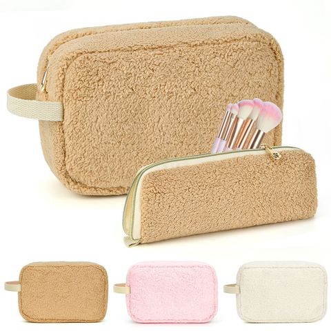 Nuevo estilo, conjunto de dos piezas con logotipo personalizado, bolsa de maquillaje de felpa para mujer, bolsa de maquillaje de viaje portátil, bolsa de almacenamiento de letras para venta al por mayor
